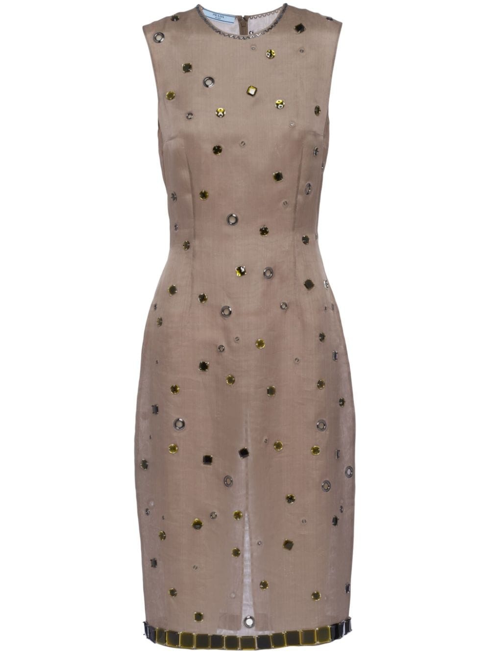 eyelet-embellished silk dress The demure sheath silhouette of this Prada midi dress is modernised thanks to eyelet embellishments. It's made from semi-sheer silk organza and further adorned with sparkling green crystals. Highlights - Khaki/beige - Silk - Organza - Semi-sheer construction - Eyelet embellishment - Crystal embellishment - Bead embellishment - Sheath silhouette - Round neck - Concealed rear zip fastening - Sleeveless - Rear slit - Straight hem - Knee-length Composition Silk 100%, glass 40%, Brass 40%, Polymethyl Methacrylate 20%
