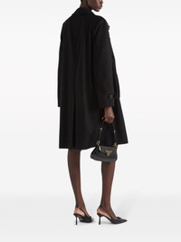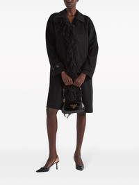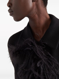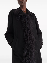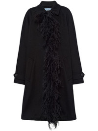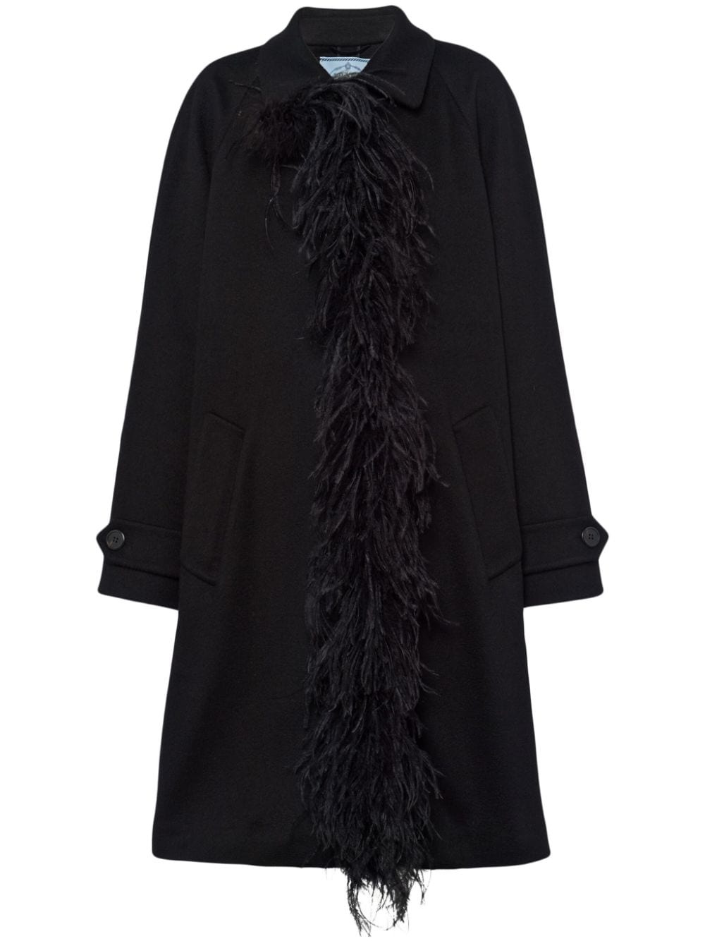 feather-trim cashmere coat Prada combines boldness and elegant craftsmanship to create this coat. Crafted from soft cashmere, the single-breasted silhouette is punctuated with feathers at the centre for a striking finish. Highlights - Black - Cashmere - Feather-trim detailing - Oversized pointed collar - Concealed front fastening - Long raglan sleeves - Belted cuffs - Two side slit pockets - Central rear vent - Straight hem - Knee-length Composition Feather 100%, Leather 100%, Cashmere 100% Washing instructions Read Manufacturer Guidelines