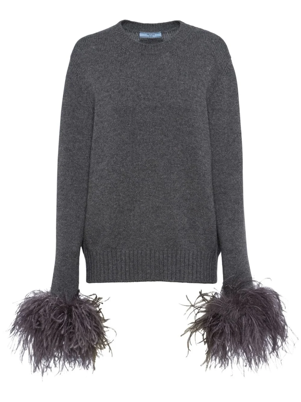 feather-trimmed cashmere jumper Expertly woven from delicate cashmere, this slate grey jumper from Prada is cut to a relaxed crew neck silhouette and opulently trimmed with plush feathers at the cuffs. Highlights - Slate grey - Cashmere - Knitted construction - Crew neck - Drop shoulder - Long sleeves - Feather-trim detailing - Ribbed straight hem - Logo patch to the rear Composition Feather 100%, Cashmere 100% Washing instructions Read Manufacturer Guidelines