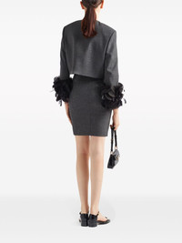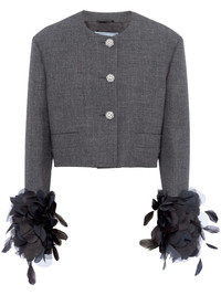 feather-trim single-breasted wool jacket Prada juxtaposes sharp lines and delicate embellishments in the design of this cropped jacket. Spun from wool to a structured silhouette, it's adorned with crystal-encrusted buttons and a frothy feather plume at each cuff. Highlights - Slate grey - Wool - Feather-trim detailing - Crystal-embellished buttons - Round neck - Front button fastening - Long sleeves - Two front welt pockets - Straight hem Composition Wool 100%