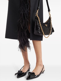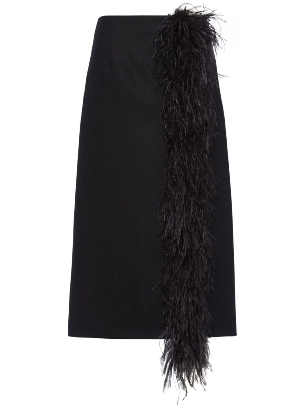 feather-trimmed wool midi skirt Prada's wool skirt is elevated with wispy flumes that cascade along the front. This black design rests high on the waist and falls to a figure-skimming midi length. Highlights - Black - Wool - Feather-trim detailing - High-waisted - Straight hem - Concealed rear zip fastening Composition Feather 100%, Wool 100% Washing instructions Read Manufacturer Guidelines