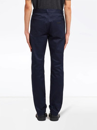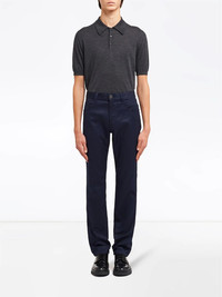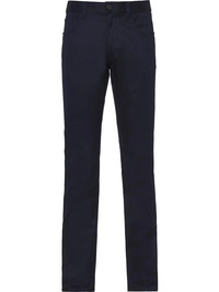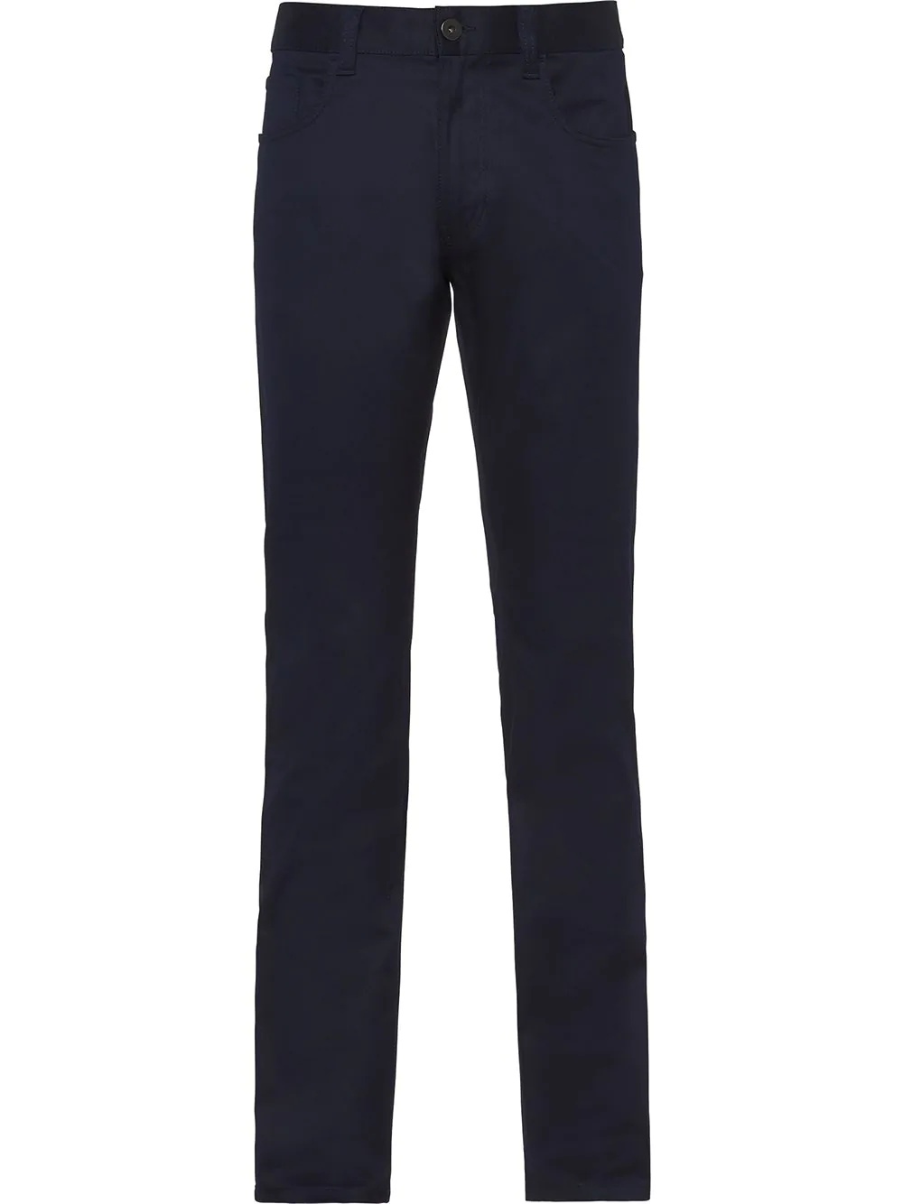 five-pocket straight-leg jeans Life feels easy when you've got comfortable trousers on. This navy blue pair from Prada boasts a straight-leg style to make them extra special. The possibilities are endless. Highlights - Navy blue - Stretch cotton - Belt loops - Front button and zip fastening - Classic five pockets - Logo patch to the rear - Straight leg Composition Cotton 98%, Elastane 2%