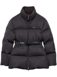 Flannel down jacket Highlights - Medium grey - Virgin wool/recycled polyamide - Padded design - Down-feather filling - Quilted - Felted finish - Melange effect - Enamel triangle logo patch at the chest - Funnel neck - Front two-way zip fastening - Long sleeves - Buckle-fastening belted elasticated waist - Two side slit pockets - Full lining - Internal pocket - Straight hem Composition Outer: Virgin Wool 100%, Calf Leather 100% Lining: Recycled Polyamide 100%, Recycled Polyester 100%, Goose Down 90%, Goose Feather 10%