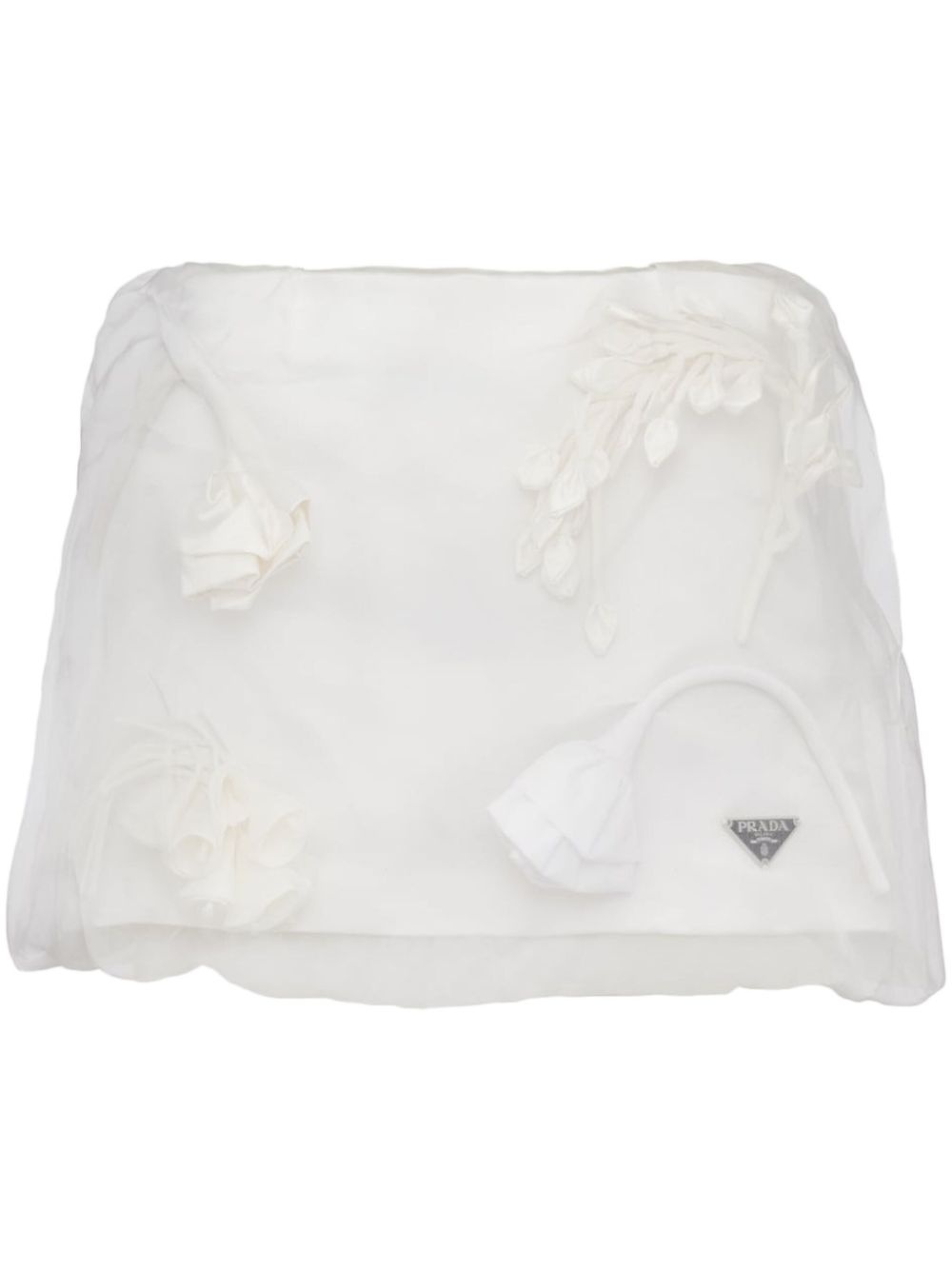 embroidered organza miniskirt Highlights - Cream white - Silk - Semi-sheer overlay - Floral embroidery - Enamel triangle logo - A-line - Concealed side hook and zip fastening - Thigh-length - Full lining Composition Silk 100% Washing instructions Read Manufacturer Guidelines