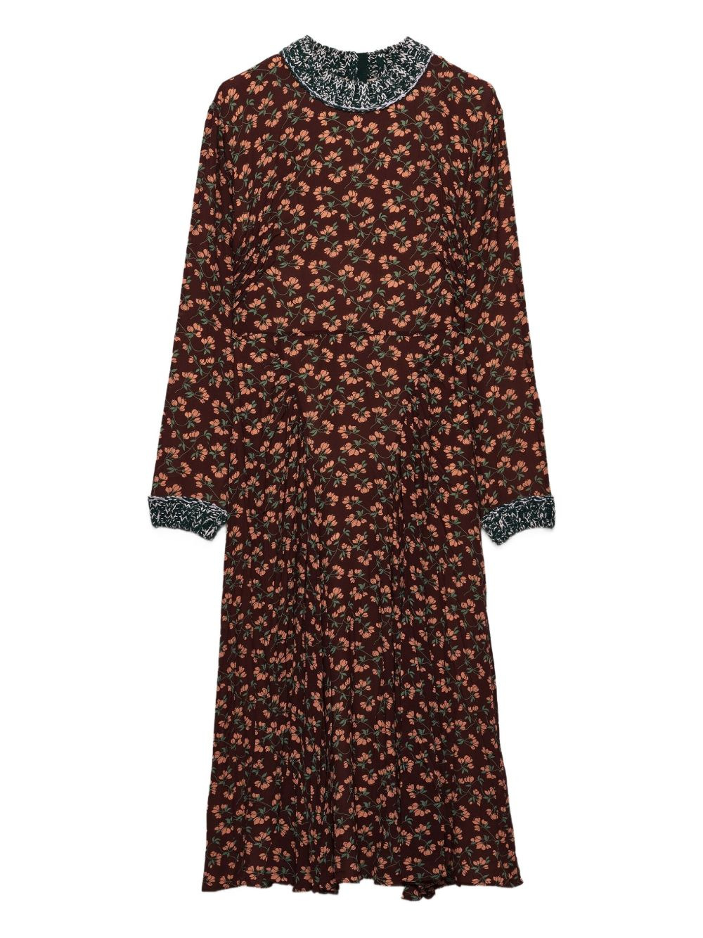 floral-print pleated knit-trim midi dress Highlights - Dark-brown - Georgette fabric - Floral print - Pleated skirt - Round neck - Long sleeves - Knit trim Composition Silk 91%, Elastane 9% Washing instructions Read Manufacturer Guidelines