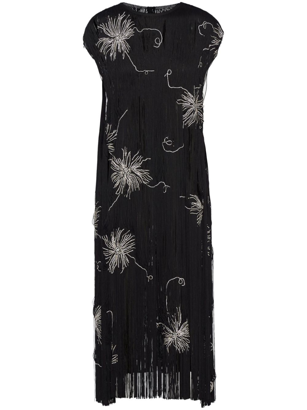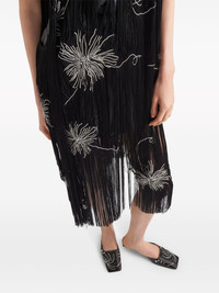 fringed embroidered dress This Prada fringed dress features silver-tone embroidered details that contrast its black colour. Their intricate spiral shape is spread all over, elevating the design. Highlights - Black - Embroidered motif - Round neck - Sleeveless - Rear zip fastening - Fringed edge Composition Viscose 100%