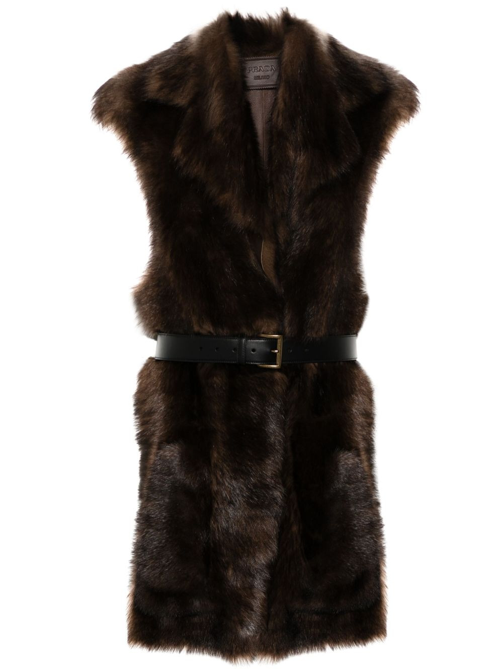 fur gilet Highlights - Chocolate brown - Fur design - Notched lapels - Sleeveless - Detachable belt - Two front patch pockets - Leather lining - Straight hem - Hook fastening Composition Outer: Calf Leather 100%, Sheep Skin/Shearling 100% Lining: Sheepskin 100% SIZE & FIT Model measurements Height 5 ft 10 in(1.77 m) Bust/Chest 32.28 in(82 cm) Hips 35.03 in(89 cm) Waist 25.19 in(64 cm) FittingInformation Designed to be unstructured, offering a loose fit throughout This piece fits true to size – take your usual size Washing instructions Specialist Cleaning