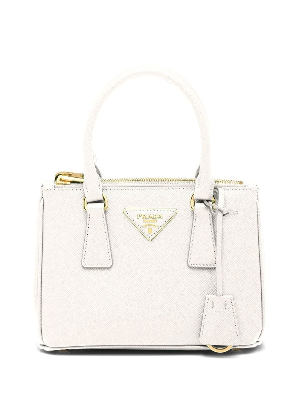 Galleria leather mini bag The Galleria bag is a fine demonstration of Prada's exquisite Italian craftsmanship, thanks to an innovative construction, composed of 83 pieces. Fabricated from signature Saffiano leather in a crosshatch texture and a waxed finish, this white-hued mini iteration is accented with Prada's iconic enamel triangle logo plaque, one of the brand's most celebrated stylistic codes. Highlights - White - Calf leather - Gold-tone hardware - Enamel triangle logo - Internal logo patch - Two rounded handles to the sides - Single shoulder strap - Internal zip-fastening pocket Composition Outer: Calf Leather 100% Lining: Nylon 100% SIZE & FIT Measurement DEPTH 3.74 in(9.5 cm) HEIGHT 5.7 in(14.5 cm) STRAP 47.24 in(120 cm) WIDTH 7.87 in(20 cm)