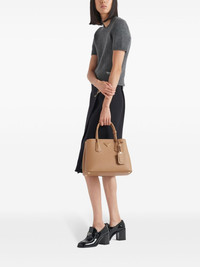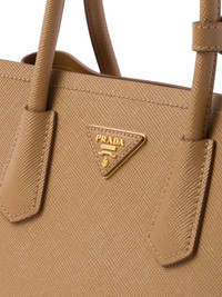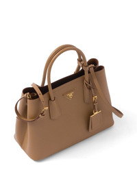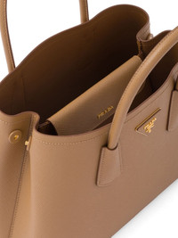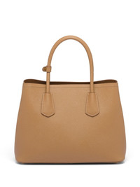Double Saffiano tote bag Prada’s bag is a scaled-down version of its iconic tote. Retaining hallmark details, it’s crafted from Saffiano leather to a structured silhouette with press-stud fasteners at the side. It’s finished with the brand’s signature Triangle logo and a detachable luggage tag. Highlights - Light brown - Calf leather - Enamel triangle logo - Gold-tone hardware - Keyring attachment - Top zip fastening - Two rolled top handles - Main compartment - Internal zip-fastening pocket Composition Outer: Calf Leather 100% SIZE & FIT Measurement DEPTH 5.51 in(14 cm) HEIGHT 9.05 in(23 cm) WIDTH 12.2 in(31 cm) STRAP 45.27 in(115 cm)
