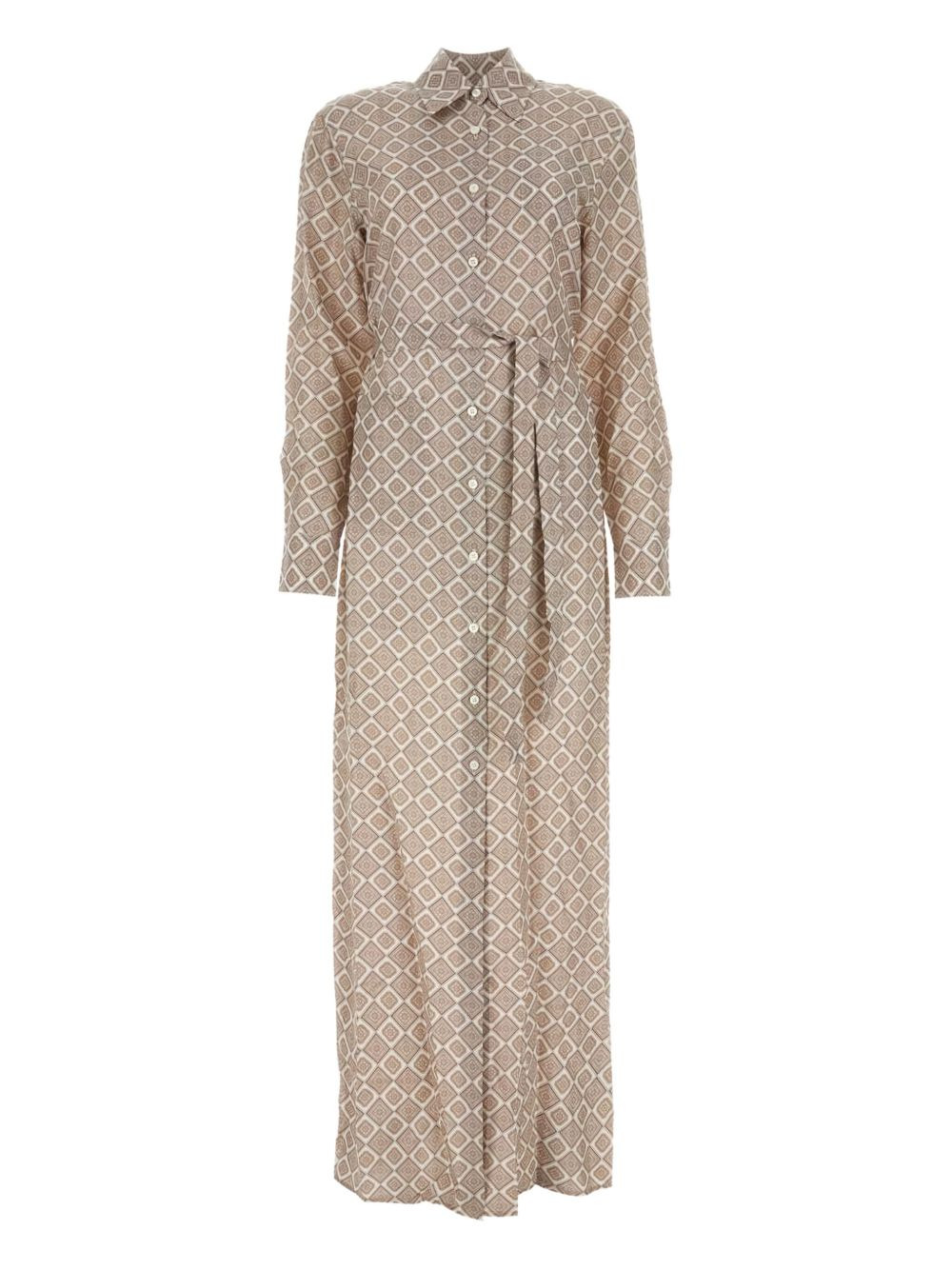 geometric-print maxi shirt dress Highlights - Beige - Geometric print - Button fastening - Long sleeves - Collared neckline - Self-tie belt Composition Silk 100% Washing instructions Read Manufacturer Guidelines