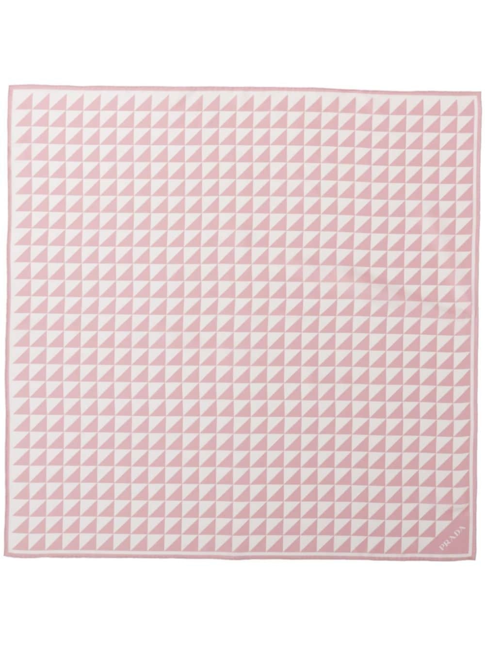 geometric-print silk scarf Prada makes a subtle nod to its iconic Triangle logo in the geometric print of this scarf, representing the brand's wish to take a more understated approach to branding. Highlights - Pink/white - Silk - Geometric print - Two-tone design - Finished edge - Square shape Composition Silk 100% SIZE & FIT Measurement LENGTH 35.43 in(90 cm) WIDTH 35.43 in(90 cm)