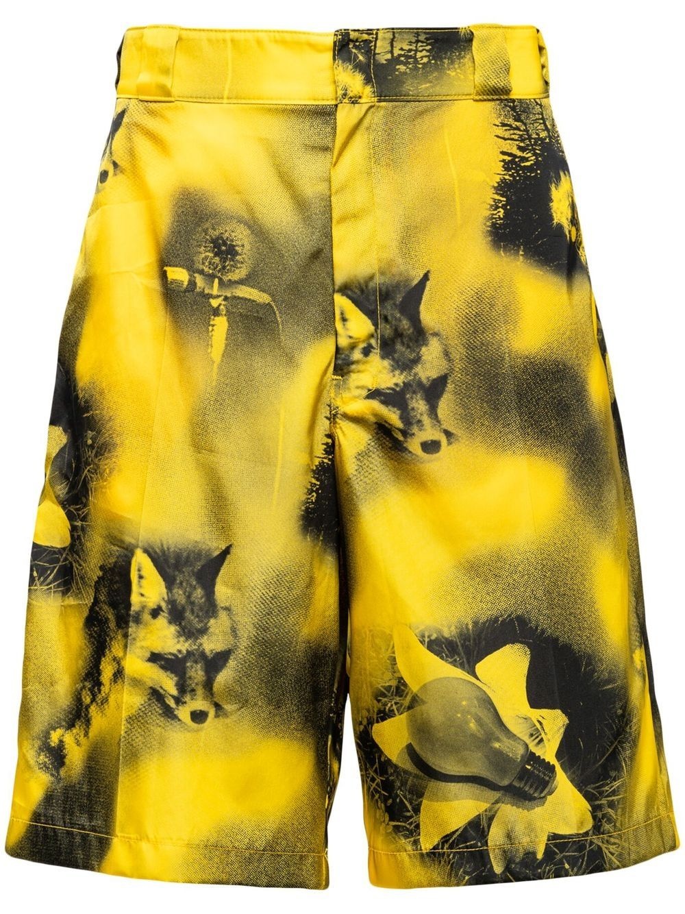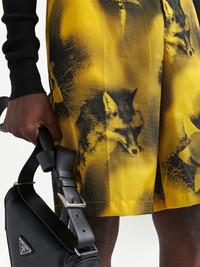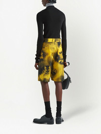 Re-Nylon Bermuda shorts Boasting a nature-inspired graphic print throughout, these Prada bermuda shorts are realised in a striking yellow and black colorway for a striking look. Highlights - Dark yellow - Recycled polyamide - All-over graphic print - Logo patch to the front - Belt loops - Knee-length - Two side slit pockets - Two rear welt pockets - Concealed front zip fastening Composition Recycled Polyamide 100%