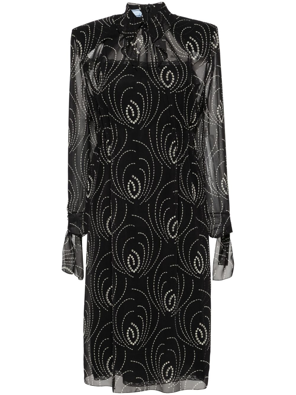 graphic-print chiffon midi dress Highlights - Black/white - Chiffon crepe - All-over graphic print - Oversized pointed collar - Short rear zip fastening - Shoulder pads - Long sleeves with tied cuffs - Elasticated waistband - Shift style - Straight hem - Mid-length - Detachable slip dress Composition Lining: Recycled Cupro 60%, Silk 40% Outer: Polyester 100% SIZE & FIT Model measurements Height 5 ft 10 in(1.77 m) Bust/Chest 33.07 in(84 cm) Hips 37 in(94 cm) Waist 24.8 in(63 cm) FittingInformation Designed for a relaxed fit, this piece allows for comfort and movement when worn The detachable slip sits just away from the body, offering a close yet comfortable fit Made from a midweight non-stretch fabric This piece fits true to size – take your usual size Washing instructions Dry Clean Only