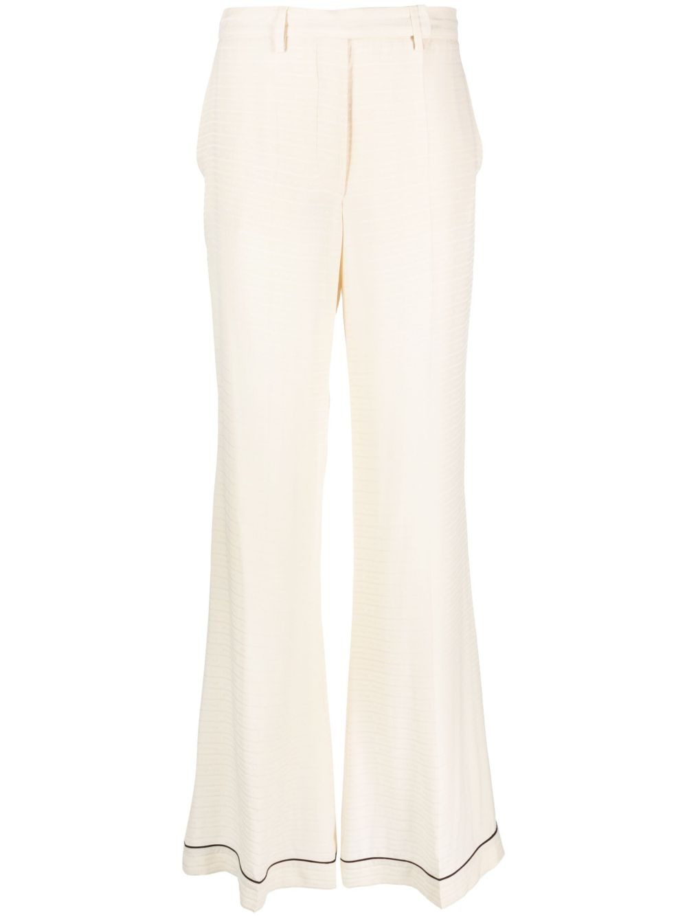 high-waisted flared silk trousers Highlights - Cream white - Silk - Tonal stitching - Belt loops - Concealed front fastening - High-waisted - Flared - Two side slash pockets - Two rear welt pockets - Straight hem Composition Silk 100% SIZE & FIT Model measurements Height 5 ft 10 in(1.78 m) Bust/Chest 33.07 in(84 cm) Hips 36.61 in(93 cm) Waist 24.8 in(63 cm) FittingInformation Designed with a wide-leg cut, these trousers allow for a close fit at the waist and offer a loose and roomy fit over the leg Made from a lightweight non-stretch fabric This piece fits true to size – take your usual size Washing instructions Dry Clean Only