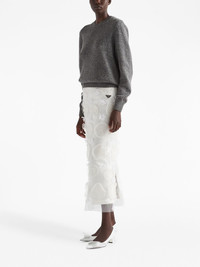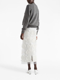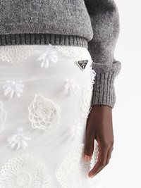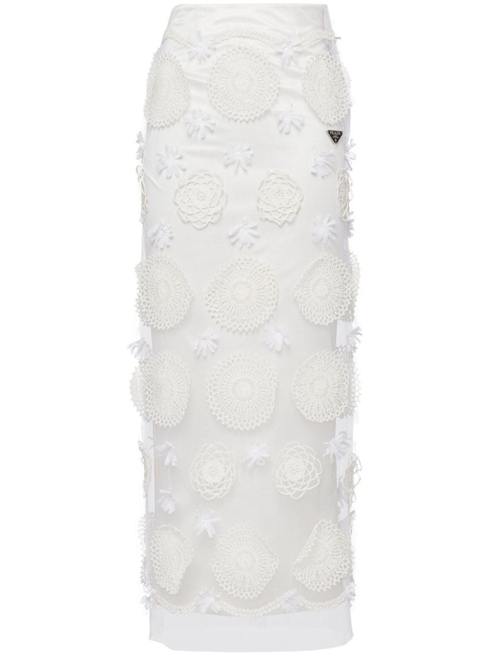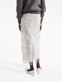 embroidered duchesse maxi-skirt A fine showcase of Prada's exquisite craftsmanship, this white skirt is cut from duchesse silk, layered with tulle and hand-embroidered with roses and flowers. The silver-tone triangle logo plaque at the side makes reference to the label's rich archives. Highlights - White - Duchess satin weave - Embroidered design - High waist - Logo plaque - 3d detailing - Rear slit Composition Silk 100%