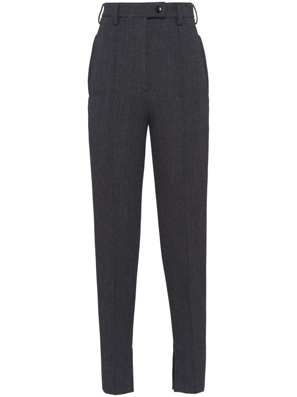 high-rise natte trousers These grey trousers are a showcase of Prada's tailoring mastery. They're cut from wool to a high-waisted silhouette that tapers through the leg. Pressed creases and split hems complete the design and make for contemporary additions to the otherwise classic aesthetic. Highlights - Anthracite grey - Wool - Pressed crease - High waist - Off-centre front button fastening - Two side inset pockets - Belt loops - Skinny cut - Split hem Composition Wool 100%