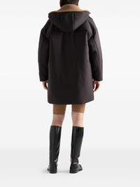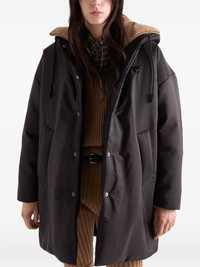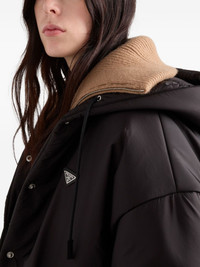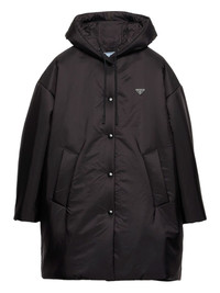 hooded snap-fit fastening coat Highlights - Black - Hooded collar - Snap closure - Welt pockets - Triangle logo - Elasticised drawstring hem Composition Outer: Nylon 100% Lining: Nylon 100% Washing instructions Read Manufacturer Guidelines