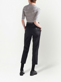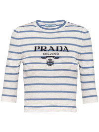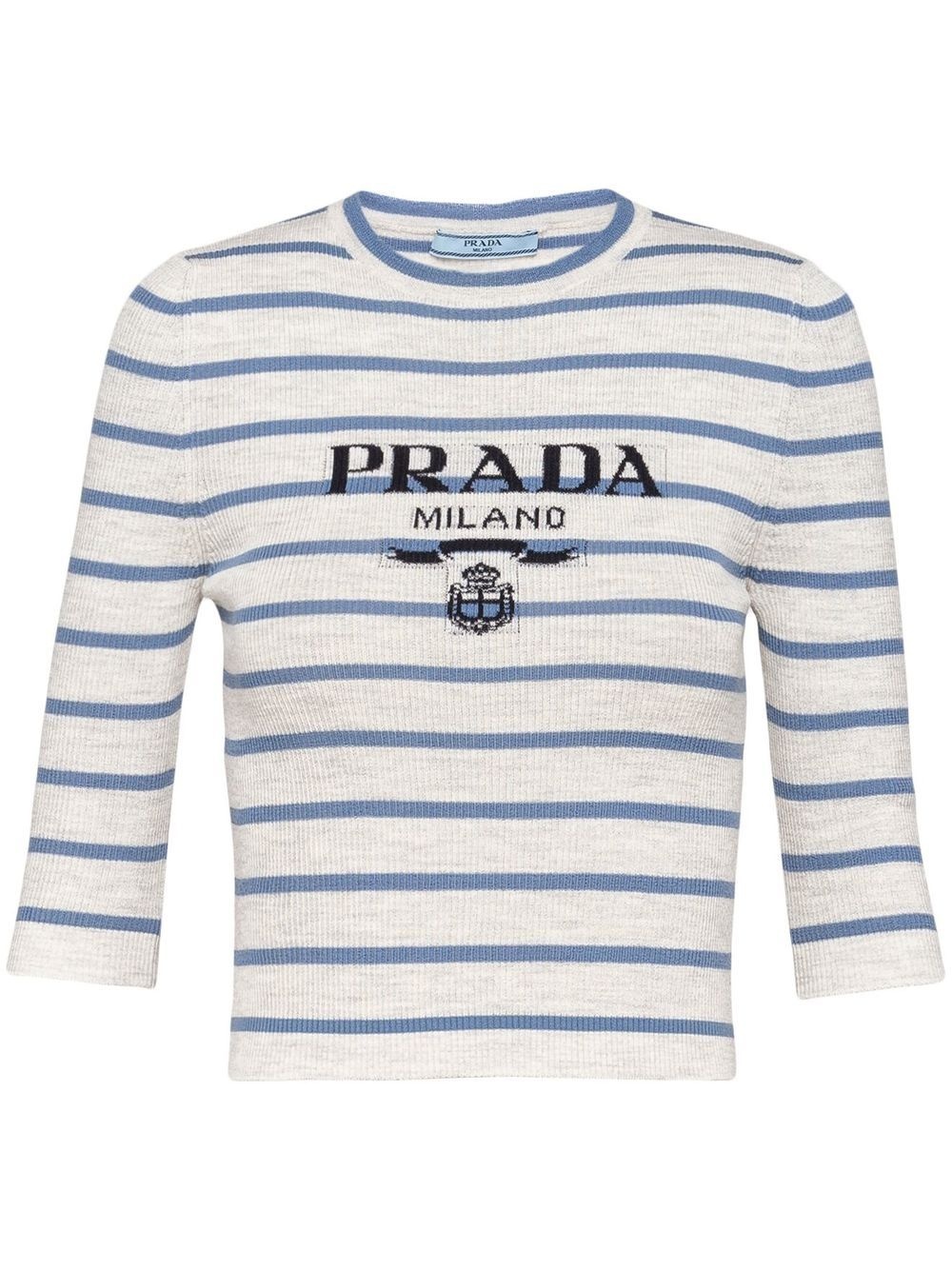 logo-intarsia wool jumper With this knitted top from the SS23 collection, Prada displays its opulent aesthetic. This garment, imagined in a delicate marble grey and periwinkle blue colourway, is made of a fine virgin wool and features a classic round neck. The chest's intarsia-knit logo adds a recognisable touch. Highlights - Marble grey/periwinkle blue - Virgin wool - Ribbed knit - Horizontal stripe pattern - Intarsia-knit logo - Round neck - Short sleeves - Straight hem Composition Virgin Wool 100%