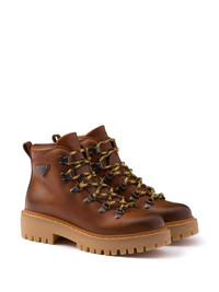 laced leather ankle boots Highlights - Brown - Calf leather - Enamel triangle logo - Embossed logo to the rear - Round toe - Bi-colour laces - Metal eyelet detailing - Pull-tab at the heel - Padded ankle - Leather lining - 45mm chunky heel - Chunky rubber sole Composition Leather 100% SIZE & FIT Measurement HEEL 1.57 in(4 cm)