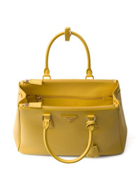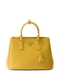 large Galleria tote bag Highlights - Yellow - Calf leather - Detachable leather key ring - Leather triangle logo - Gold-tone hardware - Side snap closure - Adjustable detachable shoulder strap - Two rolled top handles - External zipper pockets - Two internal pockets - Internal logo plaque - Nappa lining Composition Outer: Calf Leather 100% SIZE & FIT Measurement STRAP 47.24 in(120 cm) DEPTH 5.11 in(13 cm) HEIGHT 8.66 in(22 cm) WIDTH 12.59 in(32 cm)