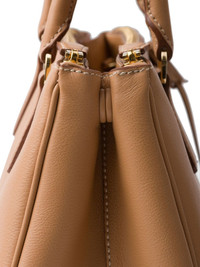 large Galleria tote bag Highlights - Light brown - Calf leather - Detachable leather key ring - Leather triangle logo - Gold-tone hardware - Side snap closure - Adjustable detachable shoulder strap - Two rolled top handles - External zipper pockets - Two internal pockets - Internal logo plaque - Nappa lining Composition Outer: Calf Leather 100% SIZE & FIT Measurement DEPTH 5.11 in(13 cm) HEIGHT 8.66 in(22 cm) WIDTH 12.59 in(32 cm)