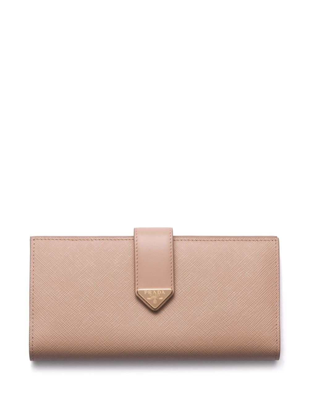 large leather wallet Highlights - Powder pink - Calf leather - Saffiano leather - Smooth grain - Strap and press-stud fastening - Bi-fold design - Triangle logo - Internal zip-fastening pocket - Internal card slots - Internal logo stamp Composition Outer: Calf Leather 100% SIZE & FIT Measurement WIDTH 7.08 in(18 cm) HEIGHT 3.54 in(9 cm)