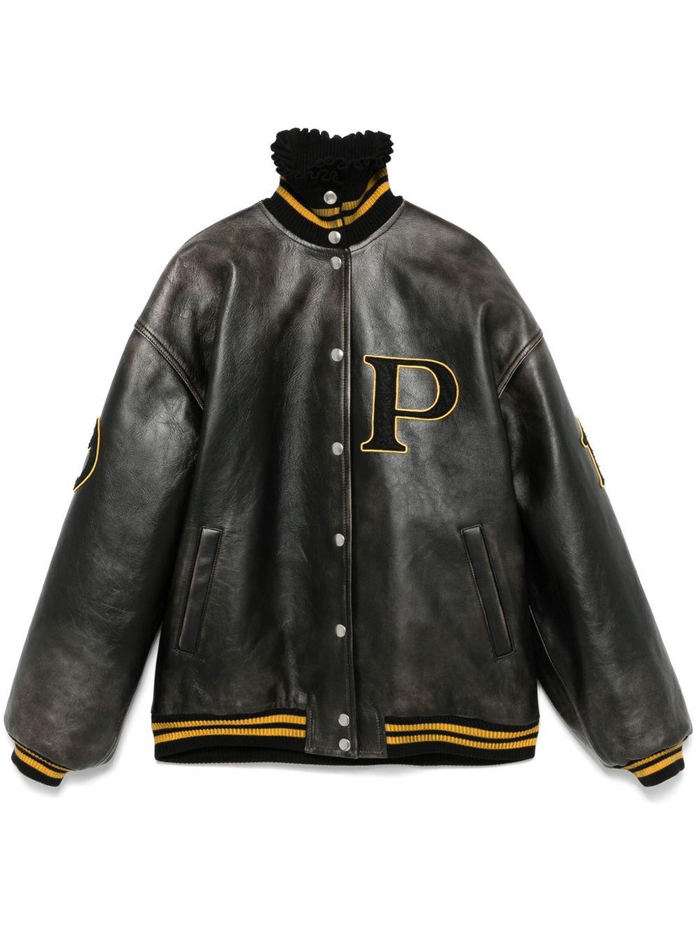 leather bomber jacket Highlights - Black - Calf leather - Crinkled finish - Faded effect - Front press-stud fastening - Ribbed band collar - Logo patch at the chest - Long sleeves - Number patch to the sleeve - Ribbed cuffs and hem - Two side welt pockets - Full lining - Straight hem Composition Outer: Calf Leather 100%, Virgin Wool 79%, Polyamide 19%, Elastane 2% Lining: Viscose 100% SIZE & FIT Model measurements Height 5 ft 10 in(1.78 m) Bust/Chest 33.85 in(86 cm) Hips 36.61 in(93 cm) Waist 26.77 in(68 cm) FittingInformation Designed to be unstructured, offering a loose fit throughout The ribbed hem offers a close, comfortable fit Firm leather offering little flexibility to maintain its durability and sturdiness Washing instructions Do Not Wash/Do Not Dry Clean