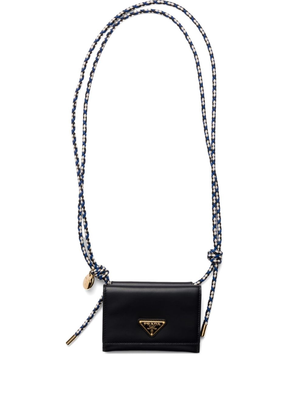 leather card holder Highlights - Black - Press-stud fastening - Adjustable shoulder strap - Card slots - Enamel triangle logo Composition Outer: Calf Leather 100%