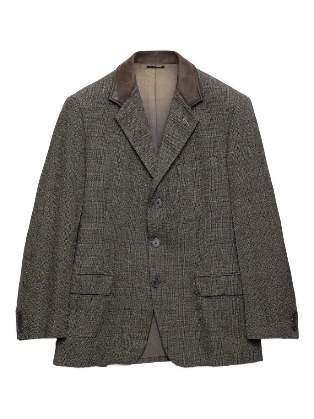 leather-collar single-breasted blazer Highlights - Grey - Leather collar - Triangle logo - Three-button closure - Buttoned cuffs - Flap pockets Composition Virgin Wool 100%, Calf Leather 100%, Mother of Pearl 100% Washing instructions Read Manufacturer Guidelines