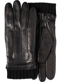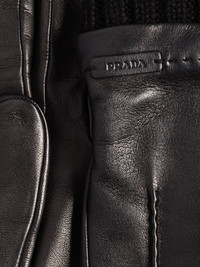 Leather Gloves Contemporary, sports-inspired Prada delivers luxury accessories that have garnered a devoted cult following. These black leather gloves from Prada features rib knit cuffs, an embossed logo patch and a cashmere lining. Composition Outer: Calf Leather 100% Lining: Cashmere 100%