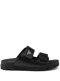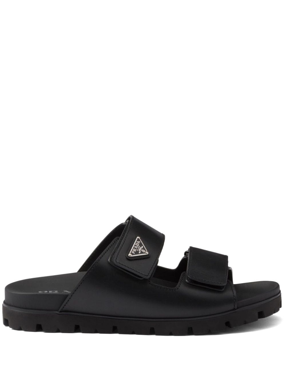 Leather strap sandals Highlights - Black - Calf leather - Smooth grain - Double-strap design - Enamel triangle logo - Logo at the sole - Open toe - Front touch-strap fastening - Branded leather insole - Rubber outsole - Slip-on style Composition Lining: Leather 100% Outer: Leather 100% Sole: Rubber 100% SIZE & FIT Measurement HEEL 0.98 in(2.5 cm)