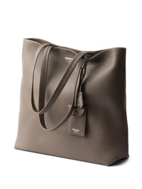 leather tote bag Highlights - Taupe grey - Open top - Two flat top handles - Internal zip-fastening pocket - Enamel triangle logo Composition Lining: Recycled Polyamide 100% Outer: Calf Leather 100%