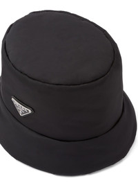 logo-applique padded bucket hat Prada's triangular logo plaque is an iconic motif for the brand that transcends seasons and trends thanks to its traditional shape and refined lettering. Finding a home on the brim of this recycled-polyester bucket hat, its silver-tone hardware elevates the casual design. Highlights - Black - Recycled nylon - Padded design - Enamel triangle logo - Flat peak - Narrow brim Composition Recycled Nylon 100% SIZE & FIT Measurement CIRCUMFERENCE 21.25 in(54 cm)
