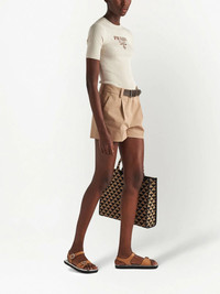 logo-intarsia silk jumper Following the brand's simple yet sophisticated aesthetic, this rib-knit T-shirt from Prada's SS22 collection arrives in a cream hue highlited by a contrasting logo on the chest. This piece has a comfortable, stretch design and is completed by a crew neck. Highlights - Ivory white - Logo-print at the chest - Crew neck Composition Silk 100%