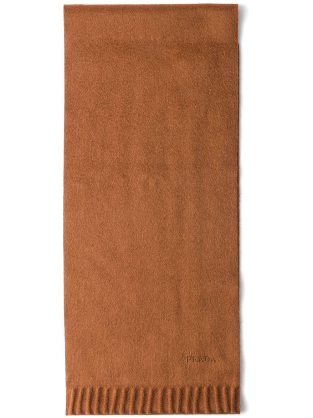 logo-embroidered cashmere scarf Highlights - Caramel brown - Cashmere - Knitted construction - Embroidered logo to the front - Fringe detailing Composition Cashmere 100% SIZE & FIT Measurement LENGTH 70.86 in(180 cm) WIDTH 11.02 in(28 cm)