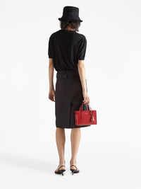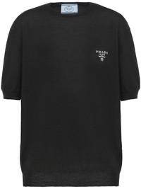 crew-neck cashmere jumper Crafted in a soft cashmere blend, this Prada knitted top is simply accented at the chest with an intarsia-knit logo for a delicate completion. Highlights - Black/white - Cashmere - Fine knit - Embroidered logo at the chest - Crew neck - Short sleeves - Ribbed cuffs and hem Composition Cashmere 100%
