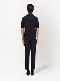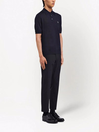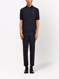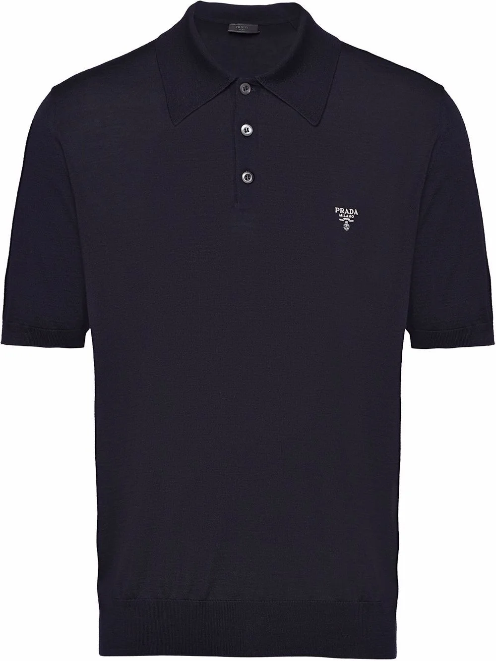 logo-embroidered wool polo shirt Navy virgin wool logo-embroidered virgin wool polo top from PRADA. Highlights - Navy virgin wool logo-embroidered virgin wool polo top from prada featuring fine knit, embroidered logo at the chest, classic collar, front button placket, short sleeves and straight hem. Composition Virgin Wool 100%