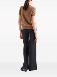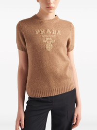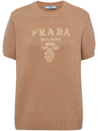 logo-intarsia cashmere-blend jumper Spun from a soft blend of cashmere and wool, this camel-brown short-sleeve jumper from Prada is adorned with a logo-intarsia motif at the front interwoven with metallic threading for a lame finish. Highlights - Camel brown/gold-tone - Wool-cashmere blend - Knitted construction - Crew neck - Short sleeves - Intarsia-knit logo - Lame effect - Ribbed hem Composition Cashmere 100%