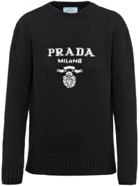 logo-intarsia wool-cashmere jumper Not your average knit. With an intarsia-knit logo front and centre, this jumper is leaving no mysteries as to its origins, and we wouldn't want it to. Prada or nada. Highlights - Black/white - Cashmere - Intarsia-knit logo - Crew neck - Long sleeves - Ribbed-knit edge Composition Cashmere 100%, Wool 100% Washing instructions Read Manufacturer Guidelines