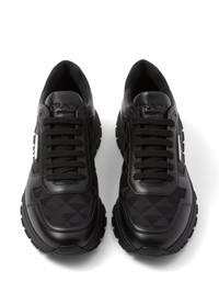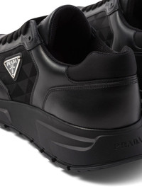 logo-jacquard leather sneakers Prada’s sneakers are a quintessential take on classic running styles. They’re crafted from panels of smooth black leather and logo-jacquard canvas that spotlights the brand’s archival Triangle motif. Highlights - Black - Leather - Canvas - Jacquard logo motif - Triangle logo - Round toe - Front lace-up fastening - Logo-debossed tongue - Branded insole - Rubber sole Composition Outer: Leather 100%, Nylon 100% Sole: Rubber 100% Lining: Fabric 100% SIZE & FIT Measurement HEEL 1.57 in(4 cm) Sole height 0.78 in(2 cm)