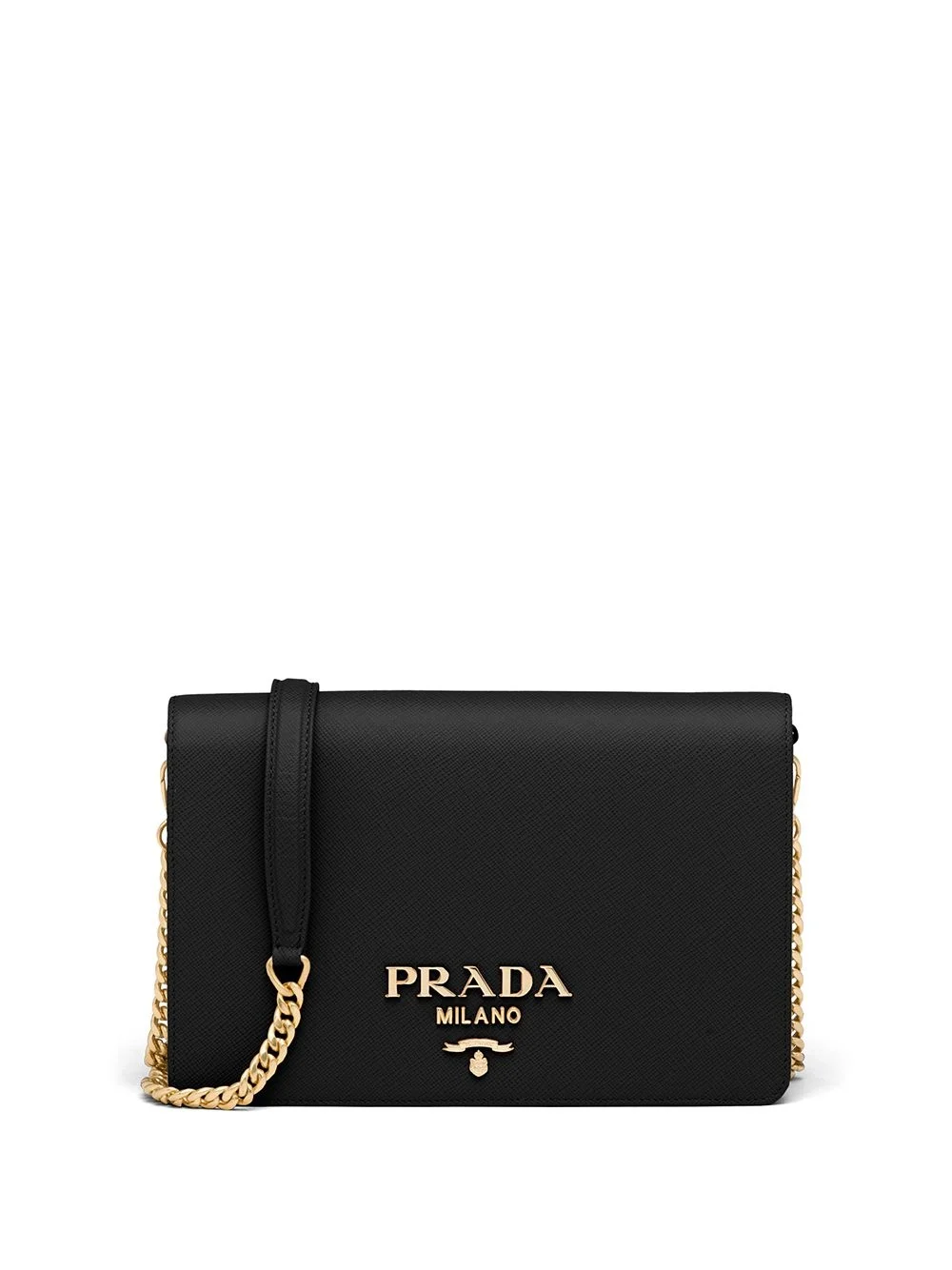 logo-lettering Saffiano leather shoulder bag Space and style. With this Prada shoulder bag, you'll get both. With a gold-tone logo lettering to the frontand a spacious interior, this Saffiano leather piece will give you the best of both worlds. Bags of style. Composition Outer: Leather 100% Lining: Nappa Leather 100% SIZE & FIT Measurement HEIGHT 5.51 in(14 cm) WIDTH 8.46 in(21.5 cm) DEPTH 1.57 in(4 cm) STRAP 41.33 in(105 cm)