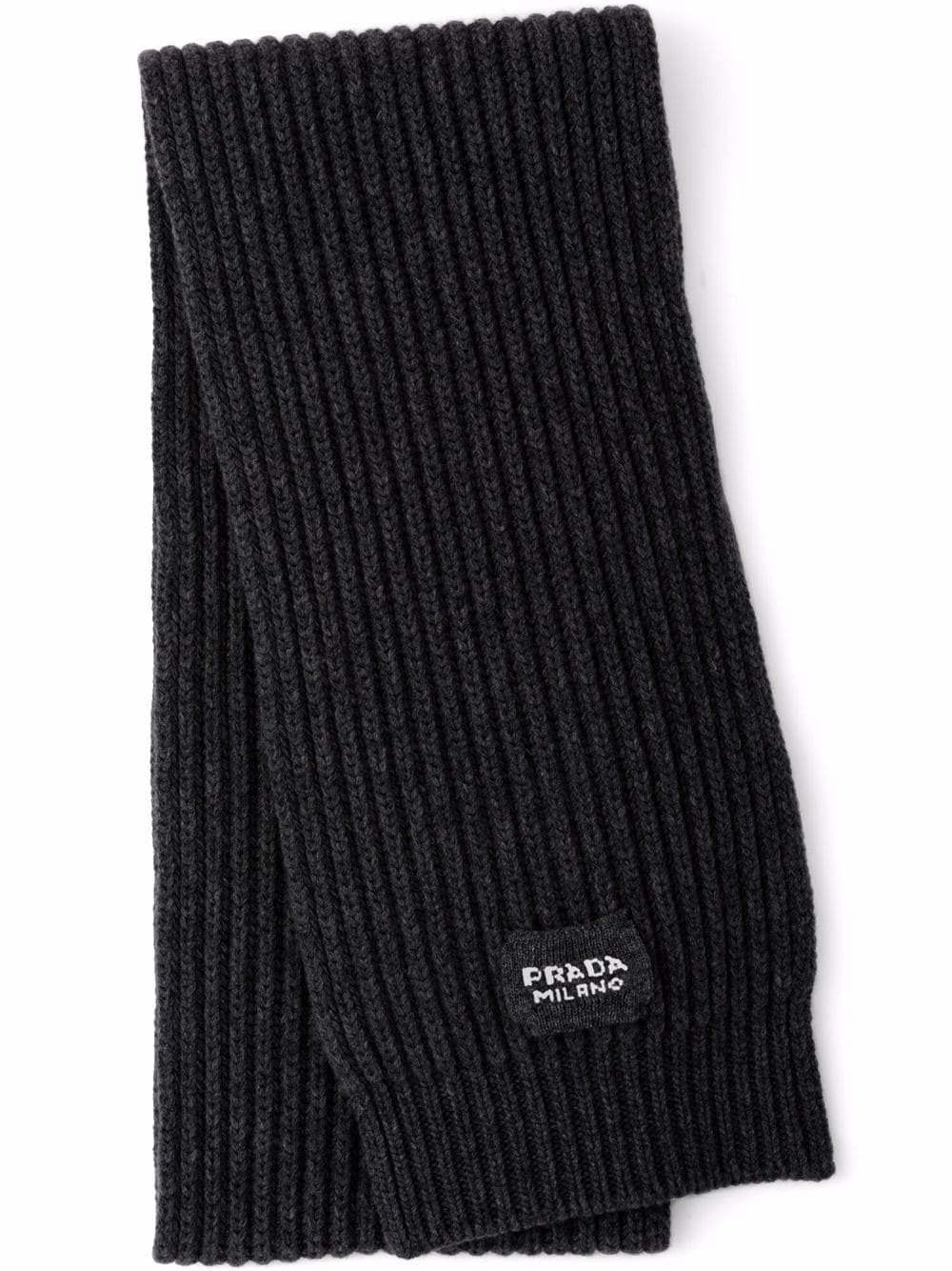 logo-patch knitted scarf Spun from soft cashmere and wool, this scarf from Prada is presented in a black chunky ribbed knit construction. The piece is subtly finished with a logo patch to the front. Composition Wool 100%, Cashmere 100%