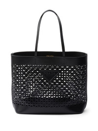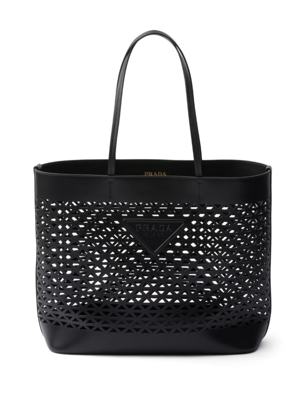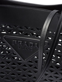 logo-perforated tote bag A symbol of quality, craft and luxury, the unmistakable triangle logo was created by Mario Prada in 1913 at a time when the maison was the official supplier of the Italian Royal Household. Today, the element adorns many of Prada's creations, such as this leather tote bag: it is placed on the front of the silhouette as an applique and also repeated in a perforated pattern. Highlights - Black - Leather - Perforated design - Triangle logo - Two top handles - Main compartment - Internal logo stamp Composition Outer: Leather 100% SIZE & FIT Measurement DEPTH 5.11 in(13 cm) HANDLE 9.44 in(24 cm) WIDTH 12.59 in(32 cm) HEIGHT 11.41 in(29 cm)