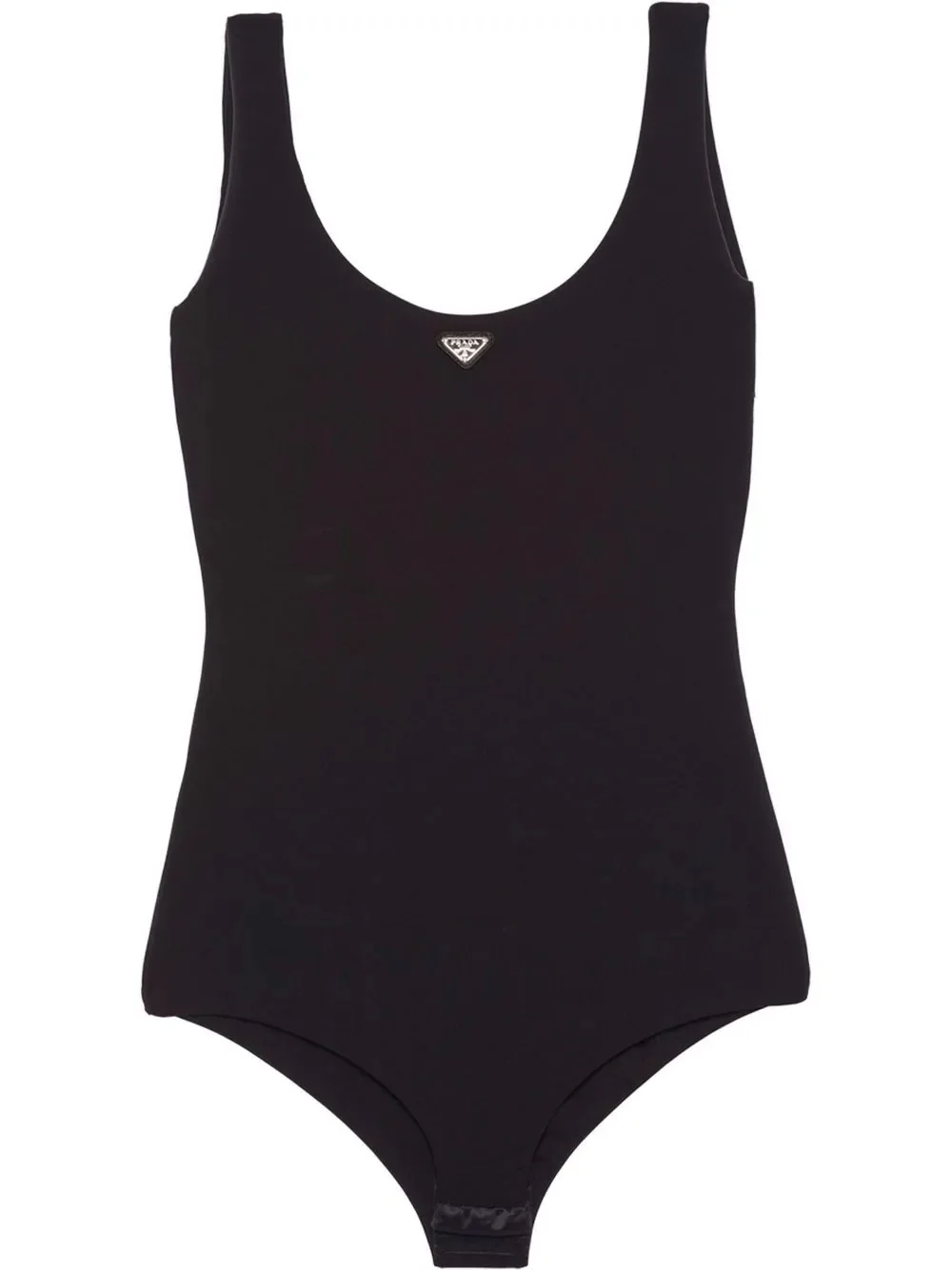 logo-plaque bodysuit Made from stretch fabric, this bodysuit from Prada makes a sleek layering piece. The scoop-neck design is decorated with a signature triangle logo plaque on the front. Highlights - Black - Enamel triangle logo - Stretch-design - Scoop neck - Scoop back - Sleeveless - Hook and eye fastening - Just a reminder that this piece must be tried on over your own garments. Composition Calf Leather 100%, Polyamide 85%, Spandex/Elastane 15% Washing instructions Machine Wash