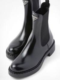 Chocolate Chelsea boots Sitting atop a chunky rubber sole, these black ankle boots from Prada tap into the brand's craftsmanship and penchant for understated styles. Made from smooth leather worked into a brushed finish, the pair is emblazoned with a signature triangle logo plaque at the front. Highlights - Black - Leather - Brushed effect - Almond toe - Enamel triangle logo - Elasticated side panels - Pull-tab at the heel - Chunky rubber sole Composition Leather 100%