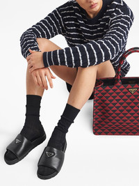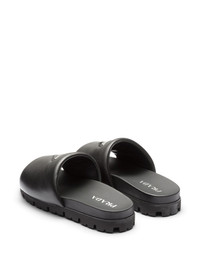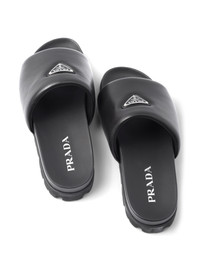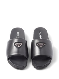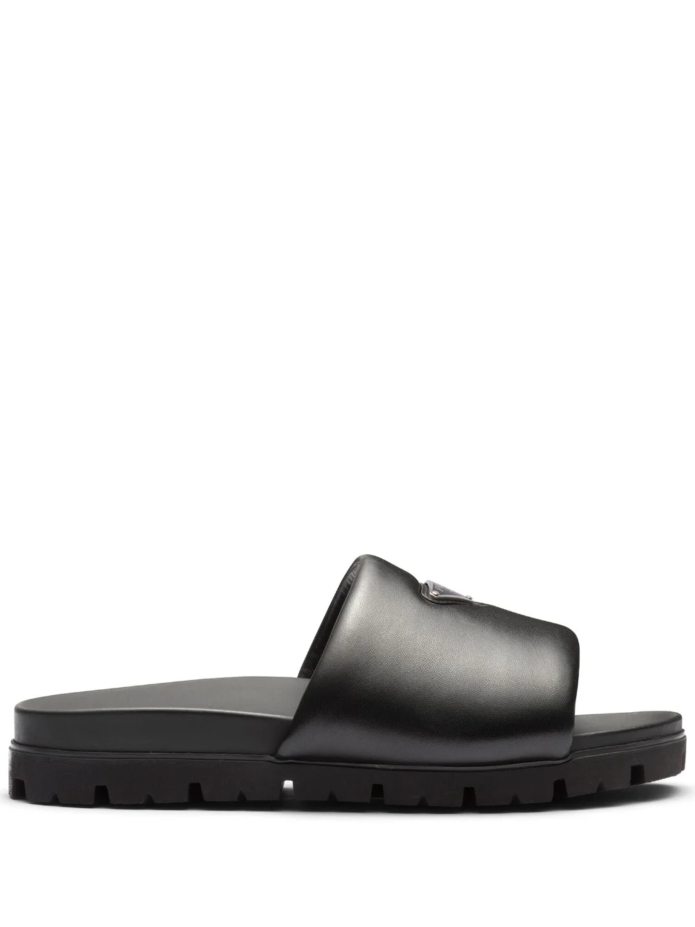 logo plaque brushed leather slides A recognisable triangle logo plaque adorns the wide strap of these black flat slides from Prada, made in Italy from brushed leather and complete with a branded insole and rubber outsole. Composition Outer: Leather 100% Lining: Leather 100% Sole: Rubber 100%