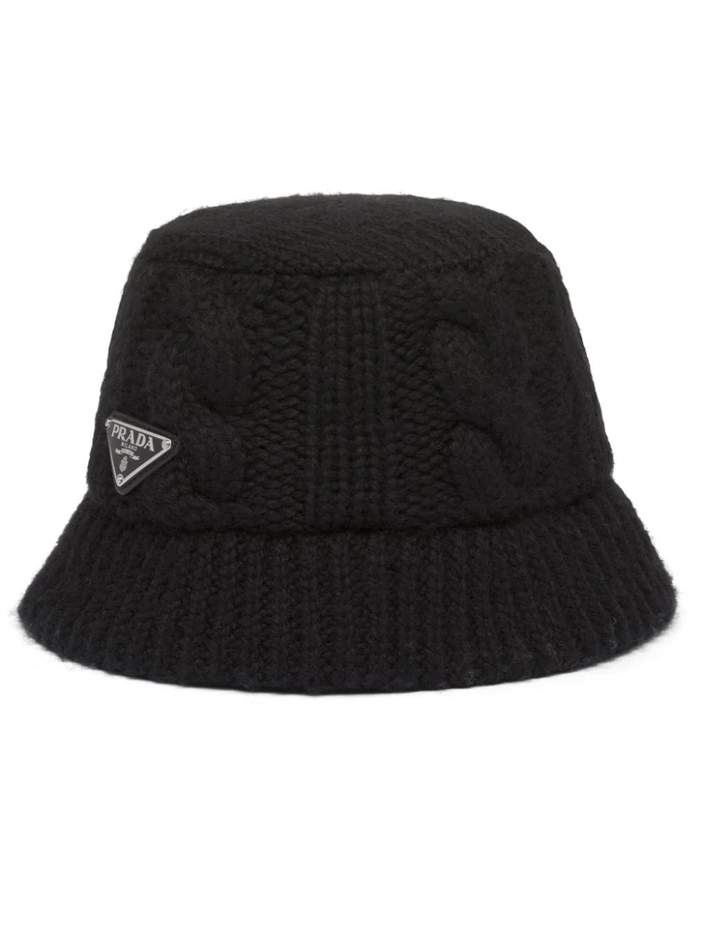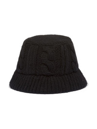 triangle-logo wool bucket hat Prada's bucket hat is refreshed in a chunky knitted design. Spun from black wool and cotton, it features ribbed and cable patterns. The triangular enamel logo plaque at the front is an iconic signature. Highlights - Black - Wool/cotton - Cable knit - Enamel triangle logo - Ribbed detailing Composition Outer: Metal 100%, Wool 100% Lining: Cotton 100% Washing instructions Read Manufacturer Guidelines