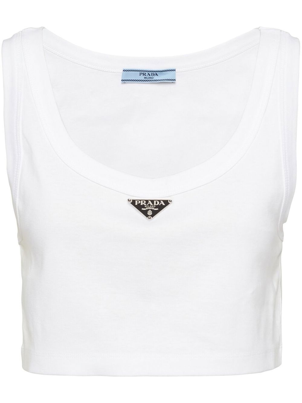 triangle-logo crop top Showcasing a minimalist design, this Prada crop top boasts its signature logo plaque to the front and is complete with ribbing throughout. Highlights - Chalk white - Cotton - Fixed shoulder straps - Logo plaque to the front - Cropped - Straight hem Composition Cotton 100%