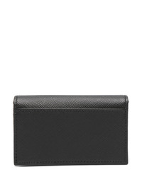 logo-plaque foldover cardholder Known for its classical Italian goods and creative edge styling, Prada produces timeless chic and sophisticated designs in every clothing line. Showcasing a perfect example of the brand's expert craftsmanship is this piece. Crafted from calf leather, this black Saffiano cardholder from Prada features a front logo plaque, a snap button closure and multiple card slots. Composition Outer: Calf Leather 100%, Metal 100% SIZE & FIT Measurement WIDTH 4.33 in(11 cm) HEIGHT 2.75 in(7 cm) DEPTH 1.18 in(3 cm)