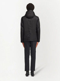 logo-plaque hooded jacket Prada's triangular logo plaque is an iconic motif for the brand that transcends seasons and trends thanks to its traditional shape and refined lettering. Finding a home on the chest of this jacket, the hooded design evokes laid-back refinery. Composition Nylon 100%